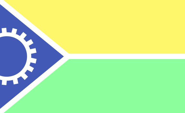 the flag are separated by a white fimbriation. The blue triangle is charged with a white half-cogwheel. The blue triangle forms an arrow representing the industrial progress, symbolized by the cogwheel, and the cultural development of the town. Green represents the plain while golden yellow represents the sun.