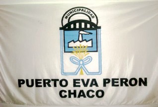 Municipality of Puerto Eva Peron in the Department of Bermejo, Chaco, has its own flag, which consists of a white field with the municipal logo on the middle and lettering "PUERTO EVA PERON / CHACO" in two rows below:
