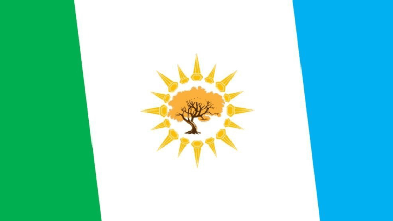 The flag is a tricolor in proportions about 1-2-1, with the stripes tilted toward the hoist, and in the centre a radiant sun in which sits a tree.