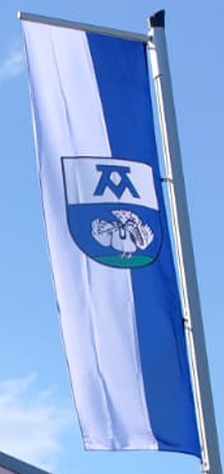 in blue for its name over it. The lower half is composed of an azure field and depicts a white turkey
