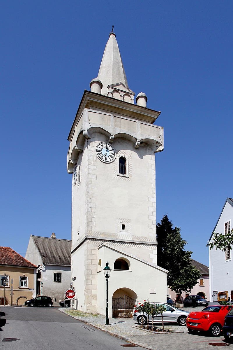 The coat of arms, granted since 1951, is dominated by the so-called "Türkenturm" (Turk Tower). The defensive tower, a remnant of the former town fortifications, was built in the first half of the 17th century, at the time of the Turkish sieges. It also symbolizes the market's jurisdiction (picture, source).