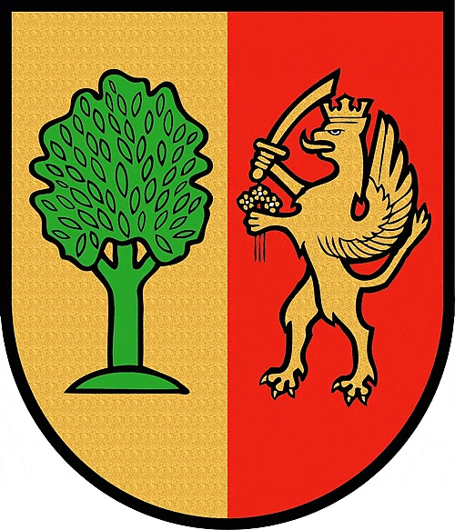 In a shield divided into gold and red, in the golden field a green tree laden with leaves, in the red