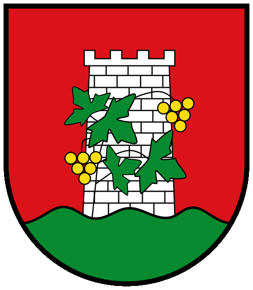On a red shield, a silver tower with four battlements, standing on three green mounts, entwined with vines bearing four vine leaves and two ripe yellow bunches of grapes.