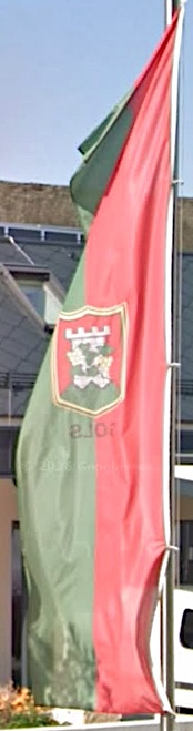 The arms were granted in 1582 by emperor Rudolf II. Despite this history they aren't presented prominently on the communal website, and only in black and white. We were able to identify three different versions: the one on the website with jagged mounts and four leaves, the one on the flags with jagged mounts and five leaves, and the one on Wikimedia with wavy mounts and four leaves.