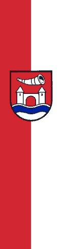 The arms were granted on 14 September 1997, and show in red, rising from a silver base charged with a blue wavy bar, a silver castle with two corner towers and pointed roofs, connected by a wall pierced by an archway; the castle is surmounted by a silver horn. The official colours are red and white.