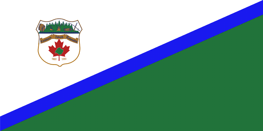 The flag of the Township of Cockburn Island in Manitoulin District, Ontario, was adopted for the township centennial in 1981. The designer of the crest (and probably of the flag) was David Haight. The flag consists of two triangles white and green divided by a blue stripe. In the white triangle is positioned the township crest.