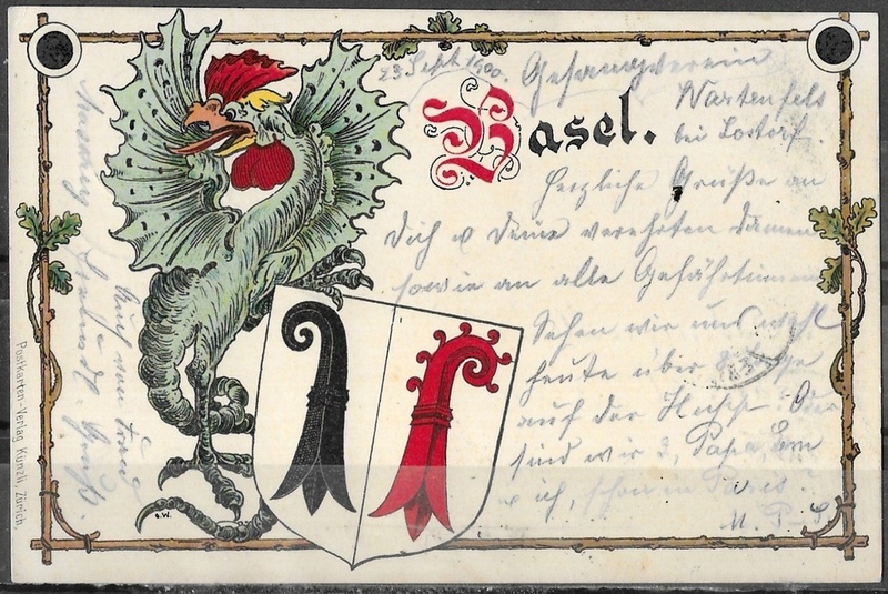– Postcard (postmark 1900) with coat of arms of Basel (common emblem) (source: ricardo.ch).