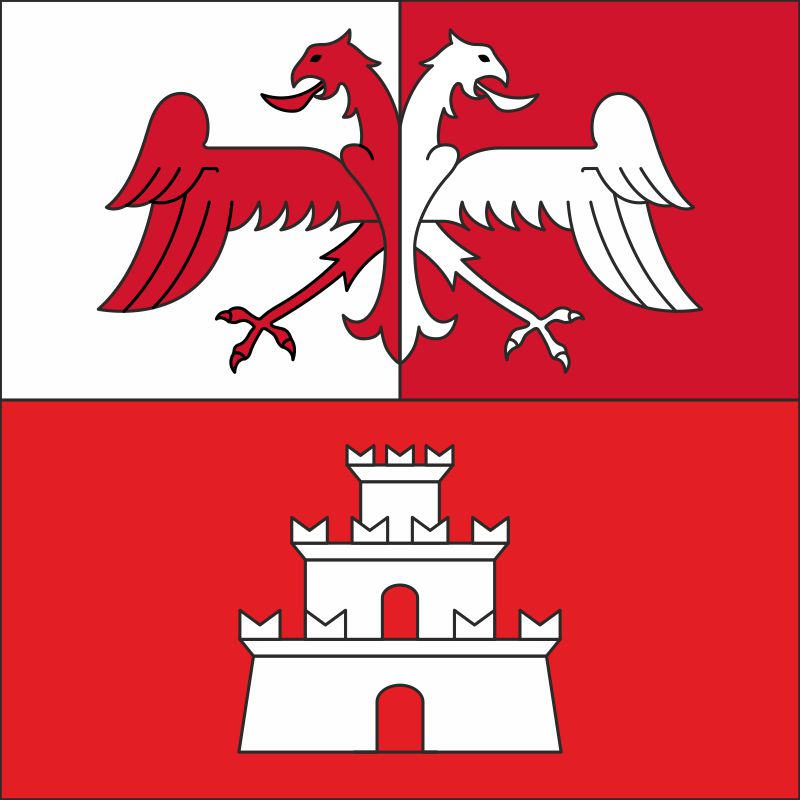 Per fess argent a tower gules issaunt and quartered gules and argent.