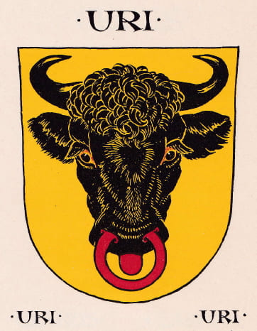The bull's head is called Uristier, meaning aurochs, Bos uris, which was domesticated by the original settlers. The red ring was originally gold. Uri citizens have been teased that the the nose ring represents the fact that the people of Uri had to be tamed. The bull has Celtic origins, representing royalty and a personification of the deity Cernunnos, who bore stag antlers.
