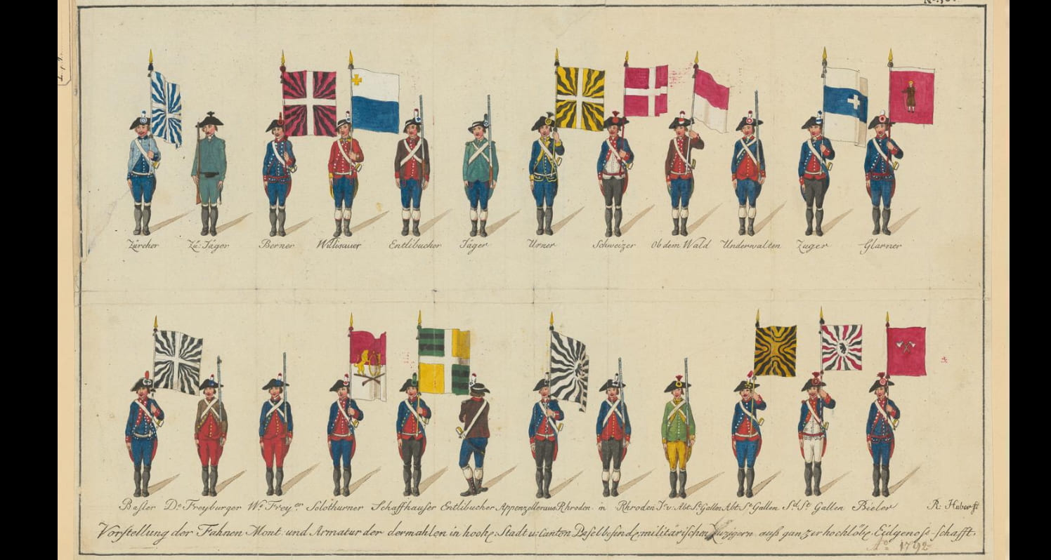 #2: Cantonal military flags at the border defense in Basel, 1792. Both old and new kind of military flags