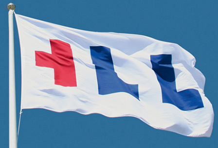Flag: It is a white flag with the right half of a red capital 'H' and two blue capital 'L's.