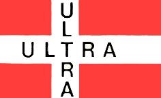 Red field, white off-centred cross, the word "ULTRA" in black letters on the white arms
