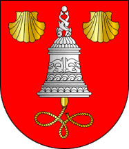 The arms have on a shield Gules a shipboard bell Argent clappered Or flanked in chief by two escallops Or.