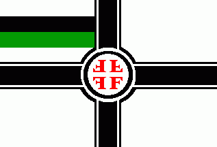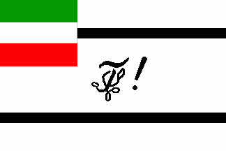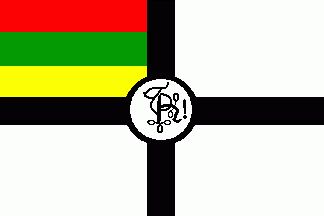 The white flag was parted by two horizontal black stripes. On centre between the stripes was the black circle of the fraternity. The canton was a green-white-red horizontal tricolour.