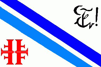The white flag was parted by a triband in bend of light blue, white and dark blue. On lower hoist quarter was a red athletics cross, on upper fly quarter the black circle of the fraternity.