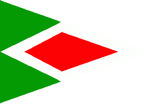 The pennant is parted per chevron of green and white. The white part is charged with a red kite, a quadrangle.