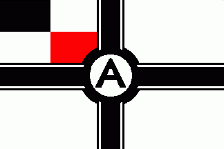 The white flag was parted by a black centred cotized cross. On centre on a white disc with black fimbriation was a black initial "A".
