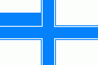 It is a white flag divided by a light blue cotized centred cross. The canton is a light blue over white horizontal bicolour. In the centre is a light blue disc surmounted by a white annulet with a white 6-point star in its centre.