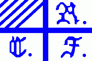 The flag was white parted by a blue centred cross. The upper hoist quarter was divided by five blue stripes in bend sinister.