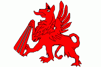 2, a right-angled divided field. The left rectangle of the flag field shows a golden, rampant lion, facing the hoist on green background.