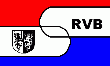 It is a blue over red horizontal bicolour, the colours of the old municipal flag. Shifted to the hoist are blue capitals "RVB" put into the corners of a white equilateral triangle fimbriated blue.