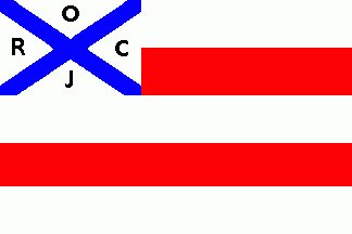 It was a white-blue horizontal bicolour. The white square canton had blue borders and was parted by a blue saltire with blue inscriptions on either quarter as follows: