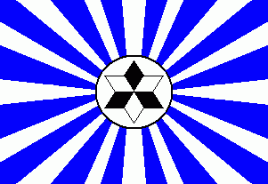 The flag was white. On centre in a black annulet was a 6-point star facetted of black and white. Emerging from centre were 16 blue rays.