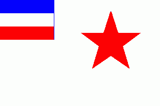 The flag was white. The canton was a blue-white-red horizontal tricolour. On upper fly was red(!) 5-point star.