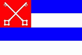 The flag was horizontally divided by four stripes alternating of blue and white. On ared canton were two white keys in saltire from the city coat of arms.