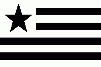 It is a 7-stripes flag horizontally divided into dark greenish blue and white stripes. The white squarish canton is divided by a dark greenish blue centred cross.