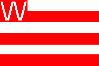 The flag was white parted by six horizontal stripes alternating of red and white (like city flag) and had a red canton with white initial "W"