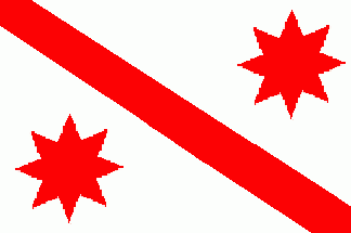The white flag (see left image above) is divided by a red bend. In the lower hoist and upper fly corner are red 8-point stars.