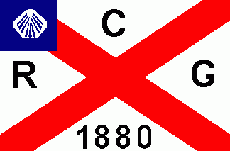 The origin is however superimposed by a white canton with two dark-blue crossed oars and dark-blue capital letters as follows: