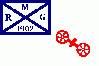 It is a plain white flag divided by a thin dark-blue saltire. The flag has a border of alternating blue and white stripes, but not at the hoist. In the white fields are dark blue capital letters "M"(top), "R"(hoist), "G" (fly) and "1898" (bottom). The flag has a white canton completely superimposing the saltires upper hoist bar. In the canton are red figures of the city's coat of arms.
