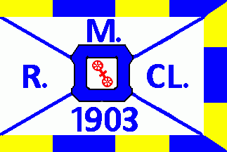 The white flag was parted by a thin blue saltire with blue inscriptions on every quarter as follows: "M."(top), "R."(hoist), "CL."(fly) and "1903"(bottom). On centre in a blue shield twere he city arms in counterchanged tinctures. On top, fly and bottom was a bordure, 11-fold parted of yellow and blue.
