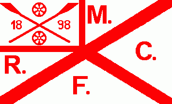 It was a white flag parted by a red saltire with red inscriptions "M."(top), "R."(hoist), "C."(fly) and "F."(bottom). The cross bar at upper hoist was completely covered by a white canton separated by red borderlines from the rest, charged with two red oars in saltire and and red applications on every quarter as follow: red 6-spokes wheel (top and bottom), "18" hoist) and "98"(fly).