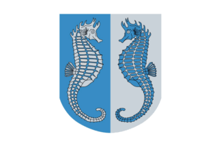 Shield parted per pale, at dexter Azure a sinister facing seahorse Argent, at sinister Argent a seahorse Azure.