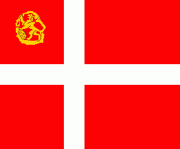 The red flag is parted by an off-centred white cross. In canton is the golden badge of the brigade,