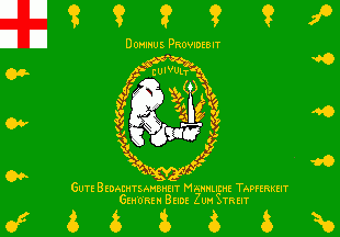 The colour was green with 19 golden (yellow) grenades flamant in orle. In canton is a Danebrog in counterchanged colours, i.e. a white square parted by a red centred cross.