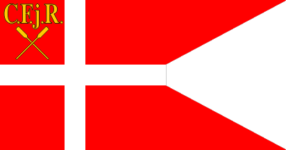 The state ensign with golden emblem in the canton consisting of the letters "C.F.J.R." (Centralforeningen for Jydske Roklubber) over two oars in saltire, all golden, approved by royal resolution on 3 April 1897.