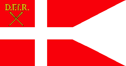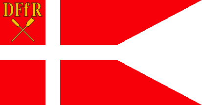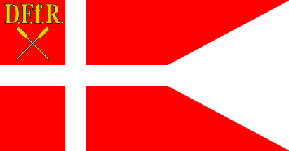 The state ensign with yellow emblem in the canton consisting of the letters "D.F.f.R." (Dansk Forening for Rosport) over two oars in saltire, all golden. The oars are set with the broader side upwards, but the Flaggenbuch (1939) drawing does not show these, instead the have what look like small cross-bars at the lower ends to signify the way they are held in the rowlocks. The flag was adopted in 1888 and would presumably still be in use. The flag was approved by royal resolution on 14 March 1888.
