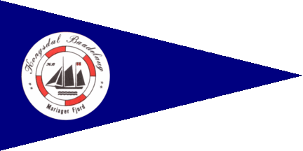 The name literally means "Pleasure Boat Guild" horizontally divided of white and red. At hoist is a blue anchor in bend above and a white inscription "ASK" below..The pennant is blue with connected white initials "AL", either thin (see left image above) or bold (see right image above) shifted to hoist. Amtoft is a hamlet in the Arup Parish near Thisted.
