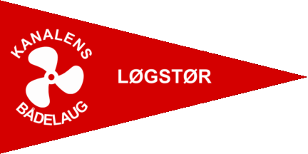 The pennant is red. At hoist is a white ship propeller surrounded by an embowed white inscription "KANALENS/BÅDELAUG" and a white inscription "LØGSTØR" at fly.