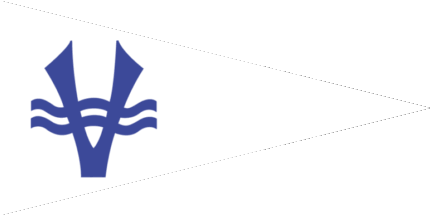 The pennant is blue fimbriated red. Shifted to hoist in a white logo, rope circle, tied beneath by a reef knot, surrounding two oars in saltire,