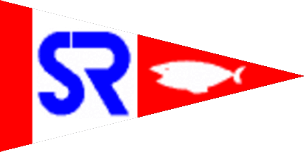 The pennant is red, shifted to hoist parted by a broad white stripe with blue inscription "SR". On fly is a white fish facing the hoist. Rundingen is located on the western shore of Zealand and belongs to Korsør, the former ferry harbour.