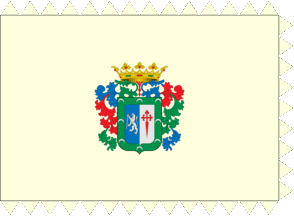 Description: Rectangular flag, ivory white in color with the coat of arms in the center and surrounded by a serrated border.