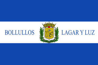 The flag (photo, photo,photo, photo) of Bollullos del Condado is horizontally divided blue-white-blue with the municipal coat of arms in the middle, surrounded by the writing "BOLLULLOS / LAGAR Y LUZ" (Wine Press and Light).