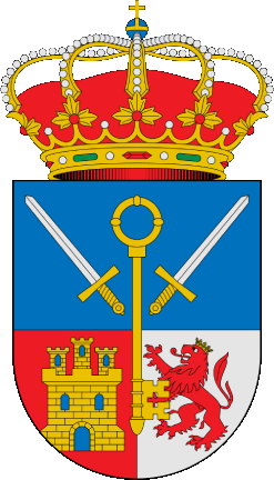 Description: Parti per fess Azure two swords in bend and bend sinister Argent hilted Or then per pale Gules a tower triple-towered of the Third windows and port of the First masoned Sable then Argent a lion rampant of the Fourth crowned Or overall a key in pale (ward to the sinister) of this Last ensigned by a Spanish royal crown Proper"