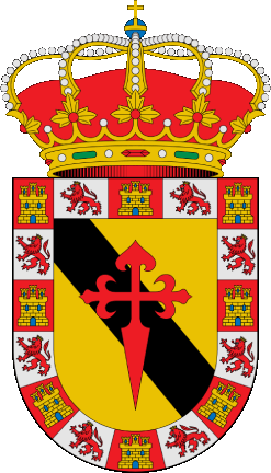 Description: Or, a bend sable, overall a cross of Santiago gules. A bordure compony of Castile and León. Crest: a closed royal crown.