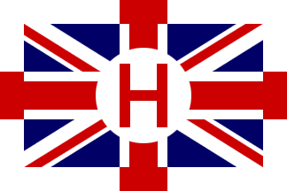 Houseflag: Union Jack over red St. George's Cross in White ground with H in Red